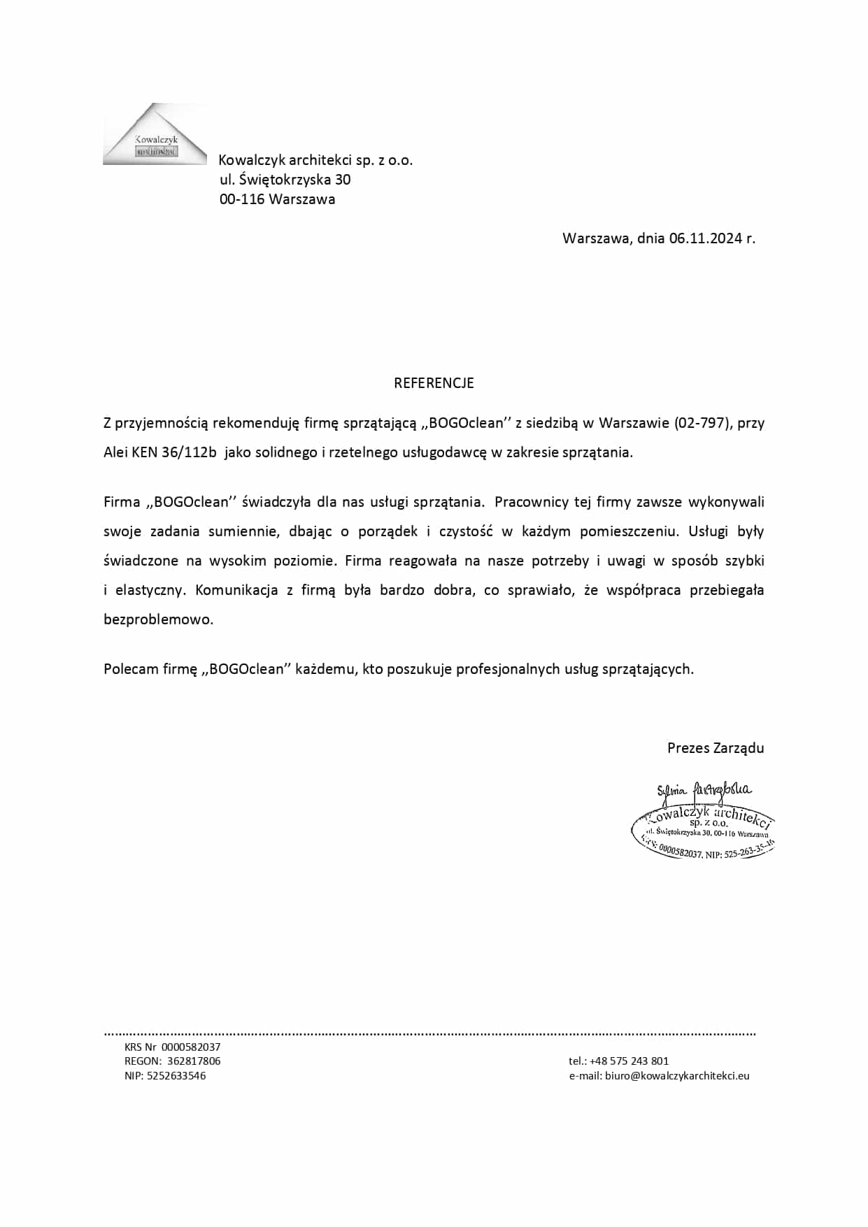 Naszą firmę klienci cenią za profesjonalizm, rzetelność i elastyczne podejście do potrzeb. Potwierdzają to liczne wyróżnienia, takie jak Orły Czystości, Laur Zaufania czy certyfikaty z zakresu dezynfekcji i BHP, które podkreślają wysoką jakość naszych usług oraz dbałość o bezpieczeństwo. Dzięki referencjom od instytucji i partnerów – m.in. Warszawskiej Szkoły Filmowej czy Omenaa Foundation – udowadniamy, że potrafimy sprostać zarówno codziennym zadaniom, jak i wymagającym realizacjom przy prestiżowych wydarzeniach. To, co nas wyróżnia, to zaangażowany zespół, terminowość i kompleksowa obsługa, które budują trwałe zaufanie naszych klientów.